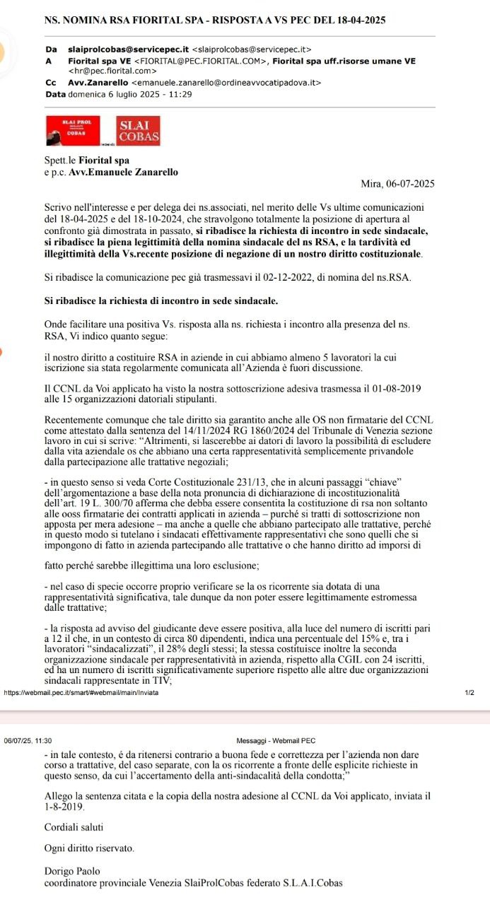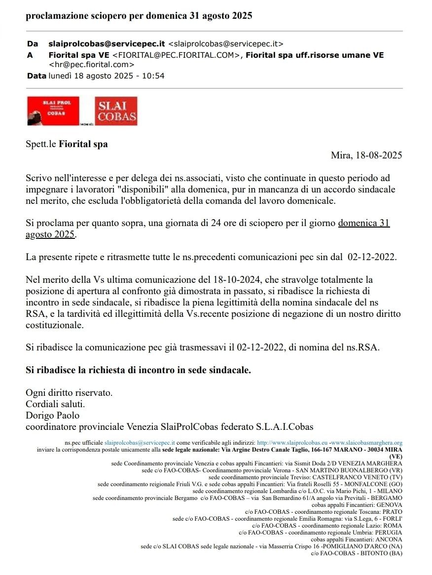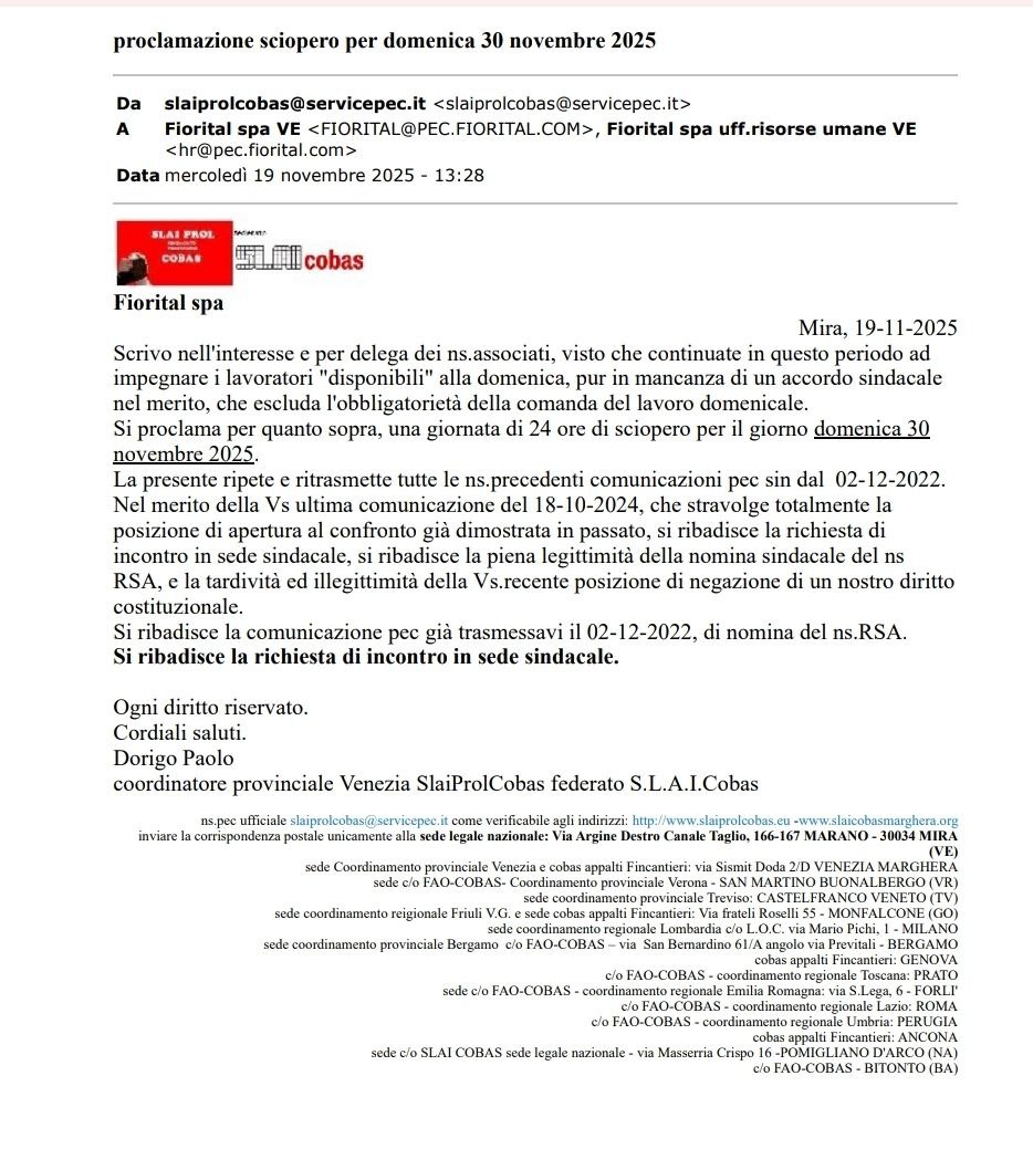 30 novembre 2025 Fiorital spa Venezia - Continua lo sciopero del lavoro domenicale introdotto arbitrariamente dall'Azienda senza alcun confronto sindacale. In questa Azienda siamo operativi prima ancora della nascita di SlaiProlCobas. clicca qui