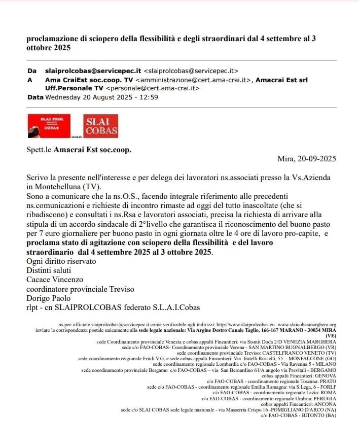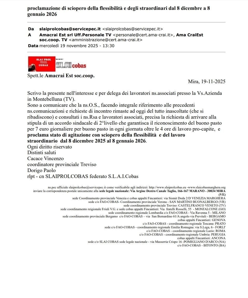 19 novembre 2025 Montebelluna (TV) - Continua lo sciopero della flessibilità e degli straordinari alla Amacrai Est - Proclamato dal 8 dicembre 2025 al 8 gennaio 2026 clicca qui