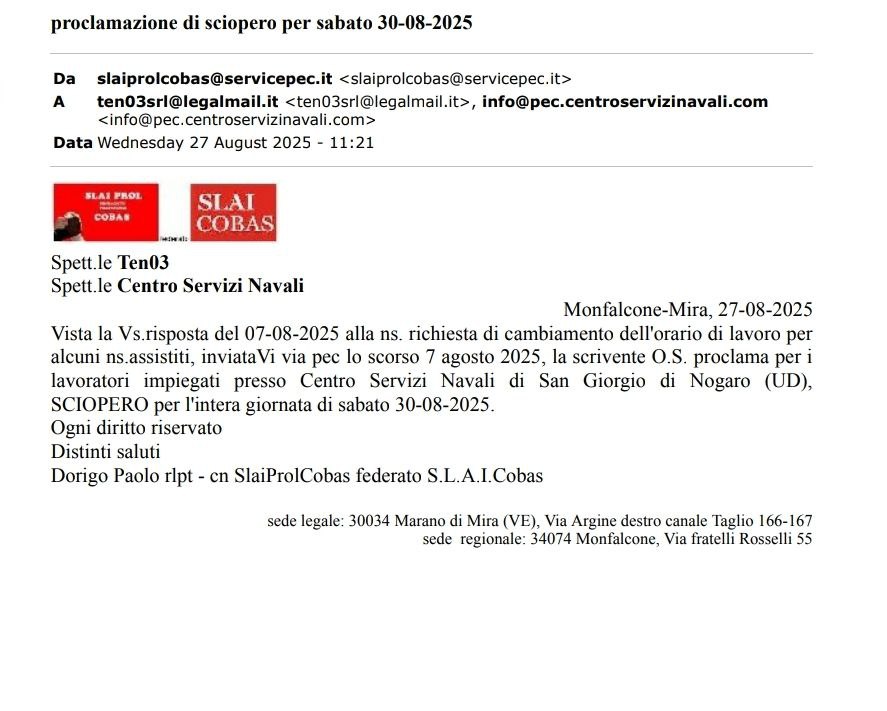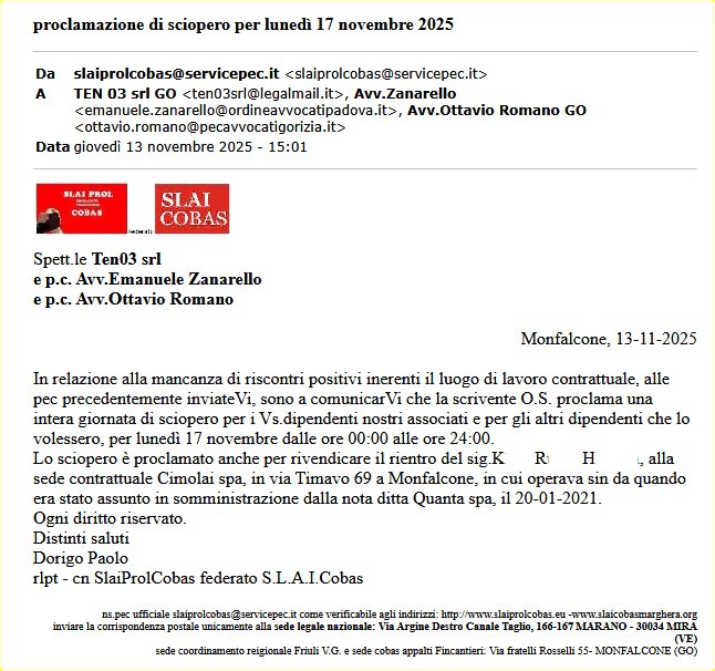 2 DICEMBRE 2025 - Licenziato Rubul da "Ten03 srl", il lavoratore trasferito da Monfalcone alla provincia di Verona !!! Sciopero proclamato per il venerdì 7 dicembre 2025