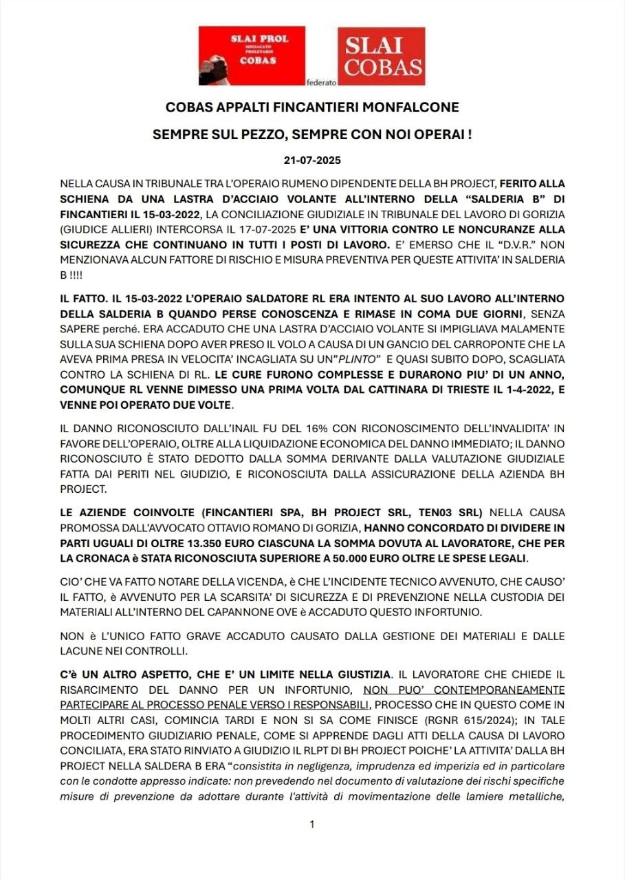 17 novembre 2025 - TATTICHE ANTISINDACALI COPERTE DAL "GIRO" DI FINCANTIERI ED AZIENDE AMICHE - Sciopero del cobas degli operai di Ten03 nostri associati di solidarietà ad un operaio intrasferta permanente da oltre un anno a San Giorgio di Nogaro (UD), ed ora da Monfalcone a Valeggio sul Mincio (VR) clicca qui - CLICCARE QUI PER: "PREMIO NAZIONALE ANTIOPERAIO 2025" LA BASE GIURIDICA DI QUESTI COMPORTAMENTI ANTISINDACALI SOTTO COPERTURA DI UNA GRAVISSIMA SENTENZA DELLA CASSAZIONE SULL'INDENNITA' DI TRASFERTA NEL CCNL METALMECCANICI