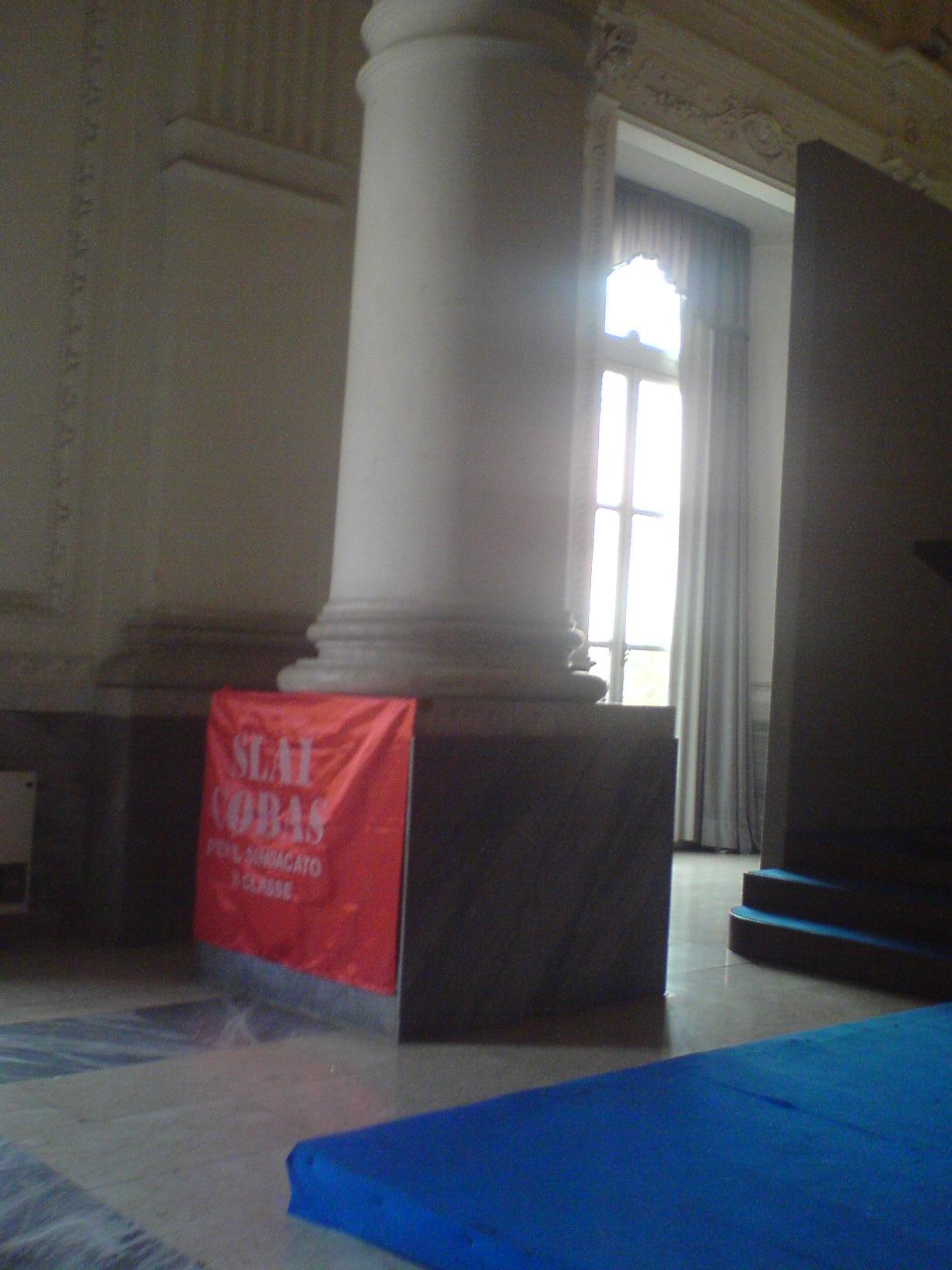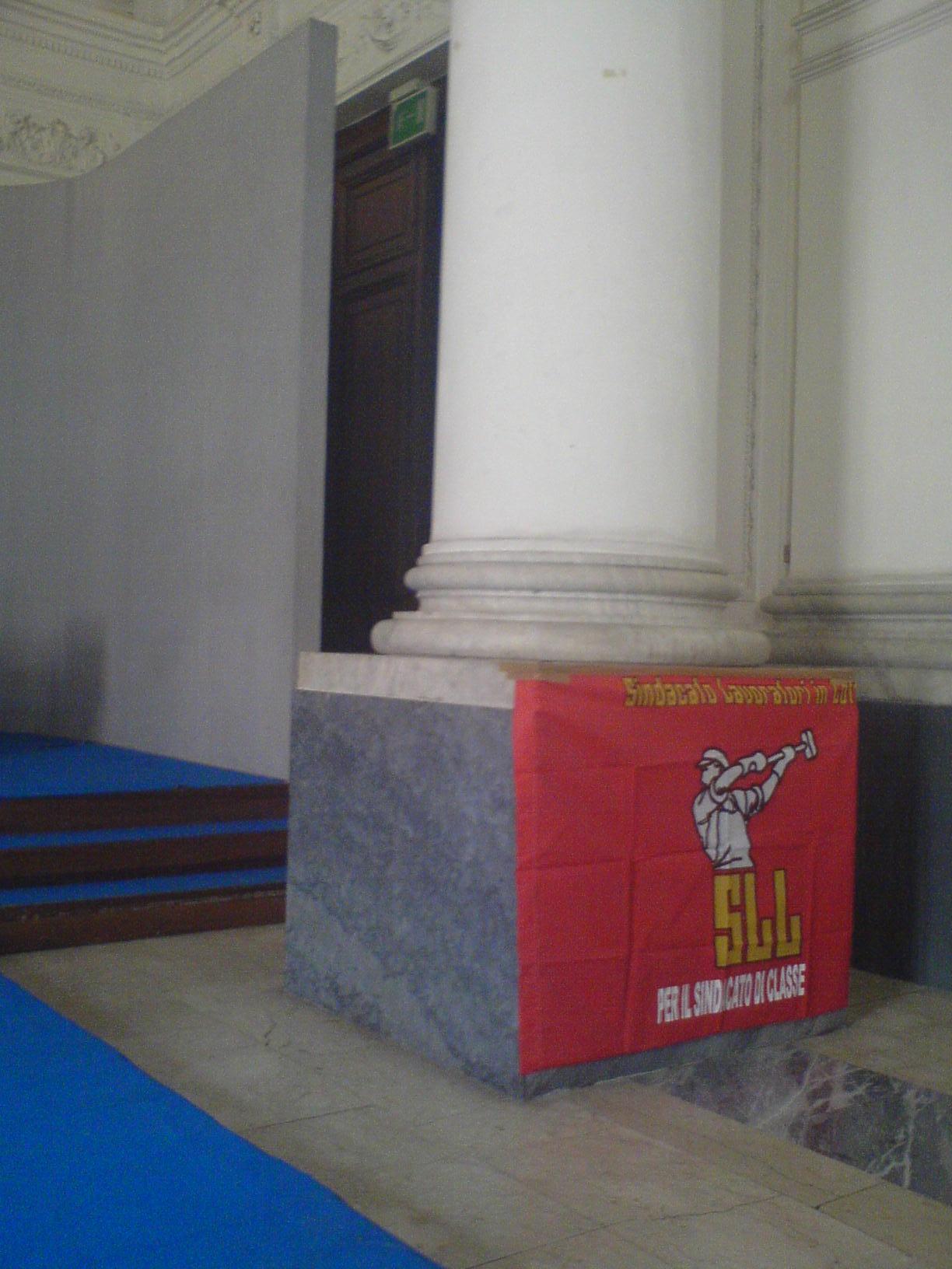 i segretari provinciale, nazionale e Presidente del SLLper il sindacato di classe, ed i coordinatori nazionale, provinciale Bergamo e Palermo di SLAI Cobas per il sindacato di classe, all'inizio dell'Assemblea