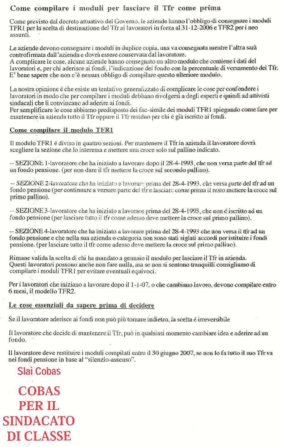 01-04-2007 A Mira permanentemente raccogliamo e diamo indicazioni per il rifiuto dello scippo del TFR ai lavoratori, presso la nostra sede di via Pascoli 5, fino al 30 giugno prossimo.