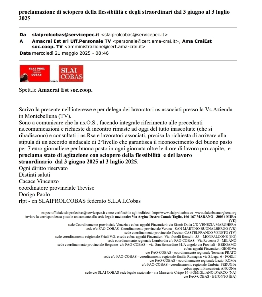 19 novembre 2025 Montebelluna (TV) - Continua lo sciopero della flessibilità e degli straordinari alla Amacrai Est - Proclamato dal 8 dicembre 2025 al 8 gennaio 2026 clicca qui