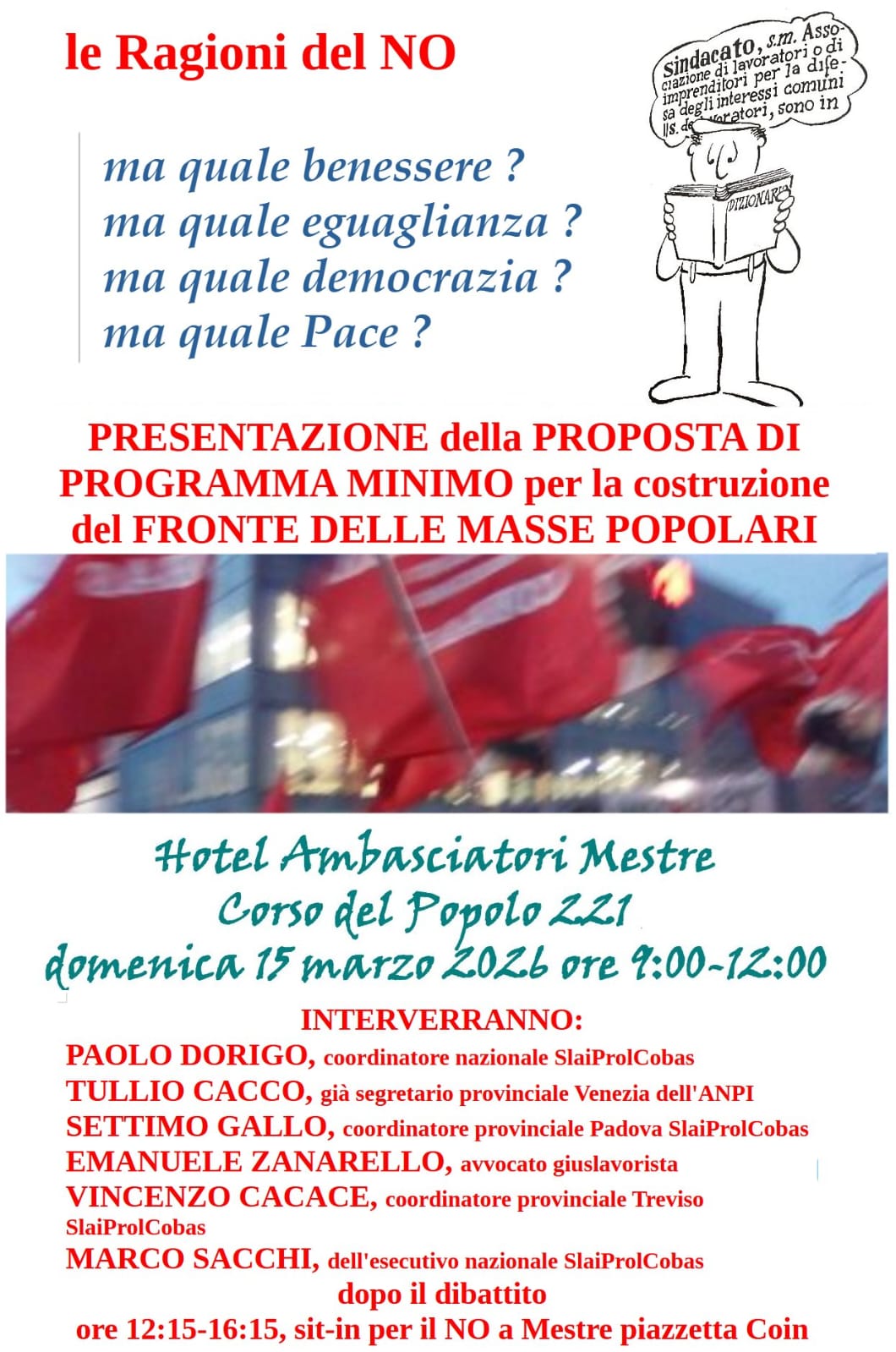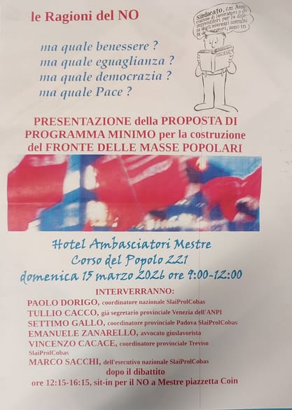 15-03-2026 Conferenza pubblica SlaiProlCobas a Mestre (VE): LE RAGIONI DEL NO - locandina clicca qui- foto 1 clicca qui - foto 2 clicca qui - Intervento dell'Avvocato Zanarello clicca qui