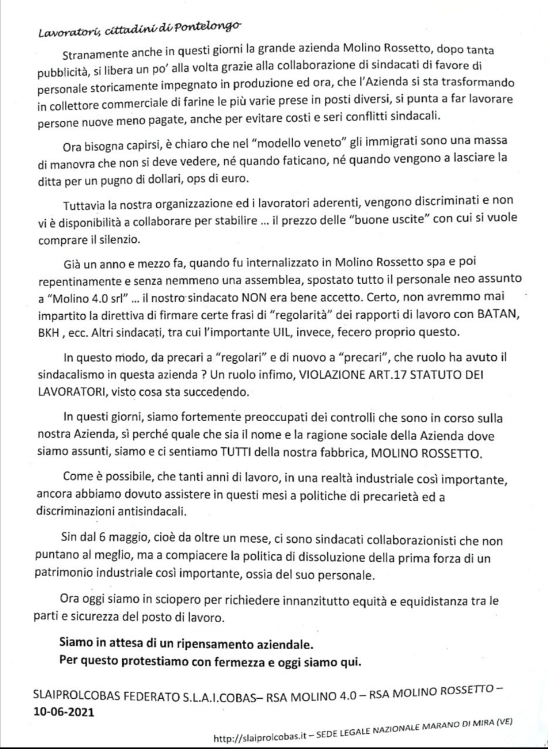 SLAI COBAS PER IL SINDACATO DI CLASSE, è FEDERATO A S.L.A.I.COBAS