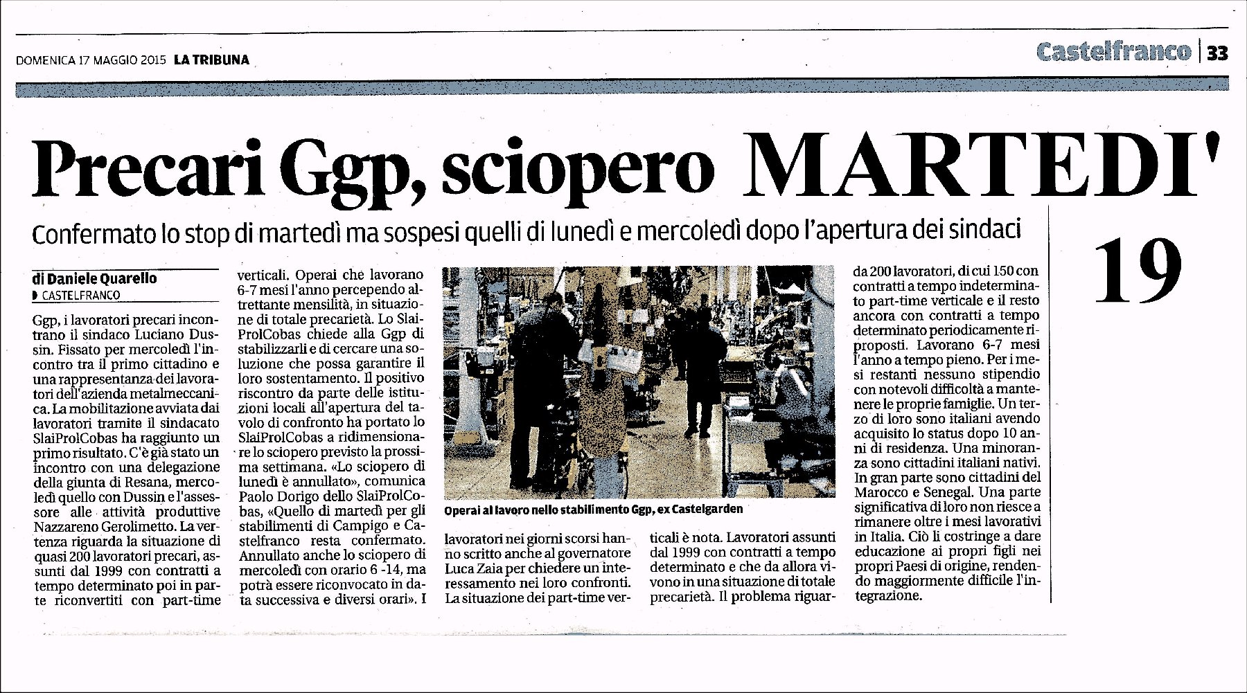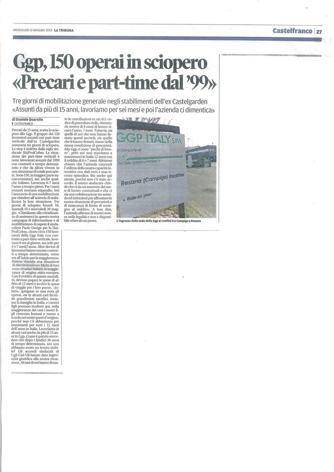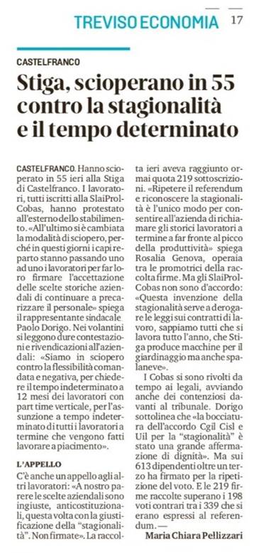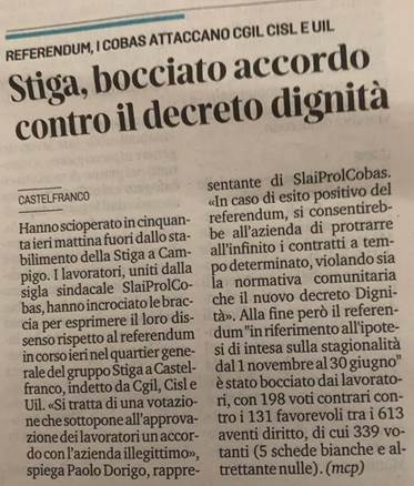 18-06-2018 – LOTTA ALLA PRECARIETA’ - REINTEGRATI 6 LAVORATORI DI GGP ITALY (ORA STIGA SPA) DI CASTELFRANCO VENETO PER NULLITA’ DEL TERMINE – AVEVANO LAVORATO ANCHE OLTRE 70 MESI – COMUNICATO SLAIPROLCOBAS – ARTICOLO TRIBUNA DI TREVISO