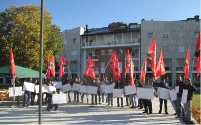 il presidio di protesta davanti la sede CISL di Castelfranco Veneto. La CISL