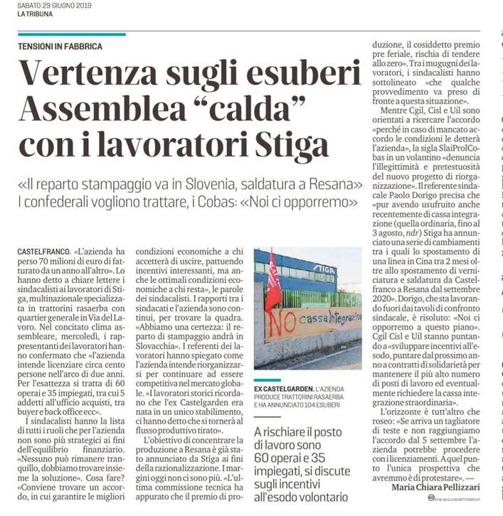 03-05-2019 CASTELFRANCO VENETO (TV) – STIGA – SLAIPROLCOBAS IMPUGNA LA CASSA INTEGRAZIONE